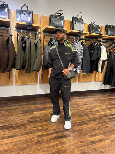 The jacket features SAINT PERRY logo leather embroidery, adding a touch of sophistication and brand identity. It also has a double-faced construction and is hand-sewn for quality craftsmanship.